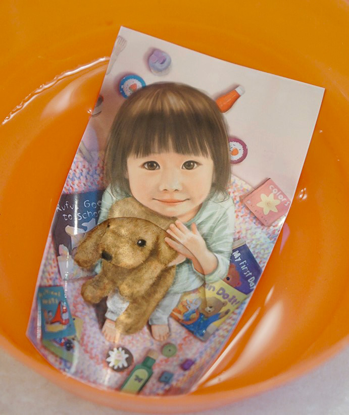 Canon PRO-300 是以油性墨水(pigment ink)列印,搭配防水列印貼紙,丕媽很好奇真的能做出傳說中的防水貼紙嗎? 所以又印了一張霜妹泡在水試驗看看…..可以耶!墨水完全沒暈開,連用布擦拭它也沒掉漆,等貼紙風乾後只有些微的縐,壓平後還是可以使用….